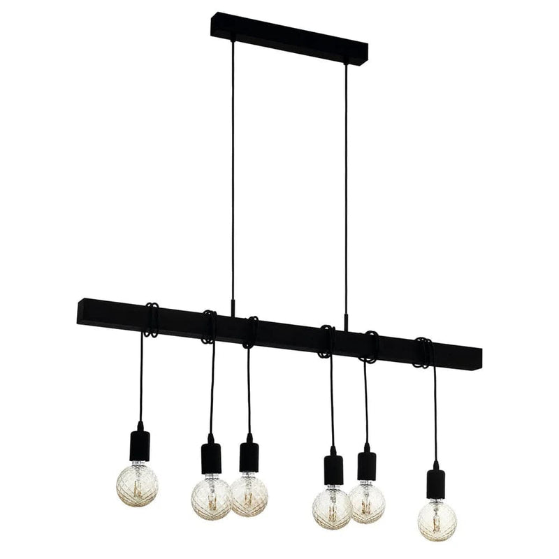 This six light pendant luminaire of the TOWNSHEND series impresses with its rustic design and the material mix of black steel and light solid wood. Pair with LED filament globes to complete the look.