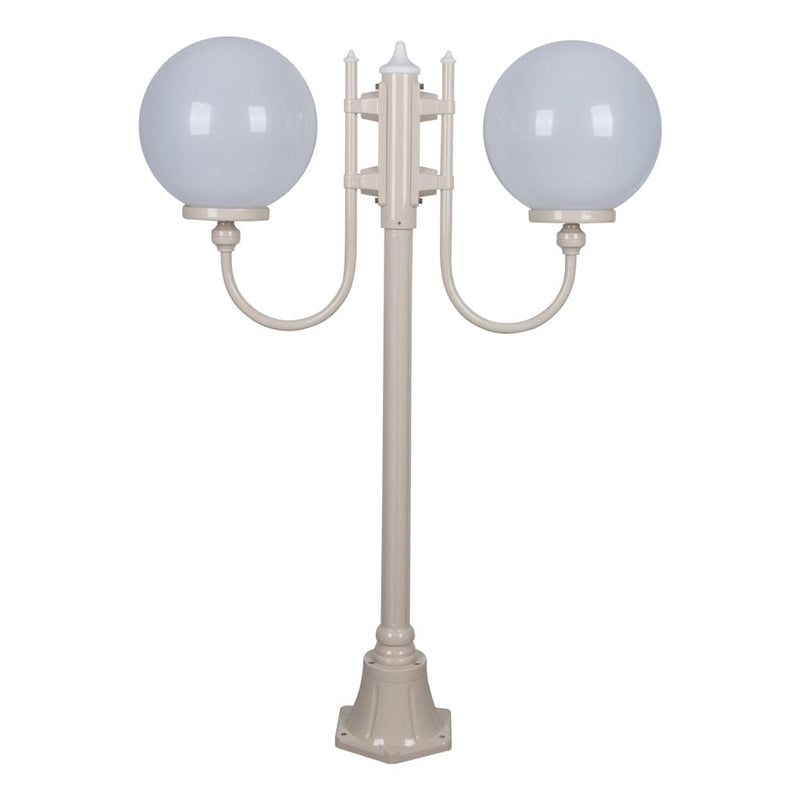 Lisbon 2 light curved arm 1.32m twin head post light, die-cast aluminium body complete with 300mm opal acrylic sphere. Made in Italy, assembled and powder coated in Australia.