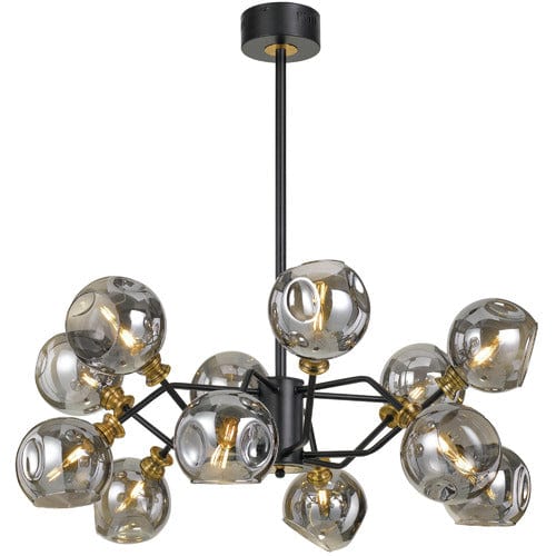 The ANNABEL pendant features clustered smoke orbs offering a contemporary deviation from the traditional pendant. The arms alternate in angle and are trimmed with luxe french gold accents. Where warm antique filament globes are used the fixture is transformed into a visually stunning statement. Available in 8 or 12 light.