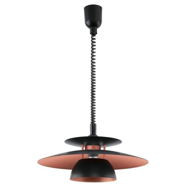 This contemporary Brenda Pulldown Black Pendant Light is constructed from plastic and steel for enhanced durability. Its dimensions are 1100mm (H) x 430mm (ø), and it weighs 2.363kg. The lamp socket is an E27, with a maximum wattage of 1x60w and a suitable bulb range of A++ - E. Available in black and copper, it is adjustable in height and has an IP20 protection rating, with protection class 2 and voltage of 220-240v, 50/60Hz.