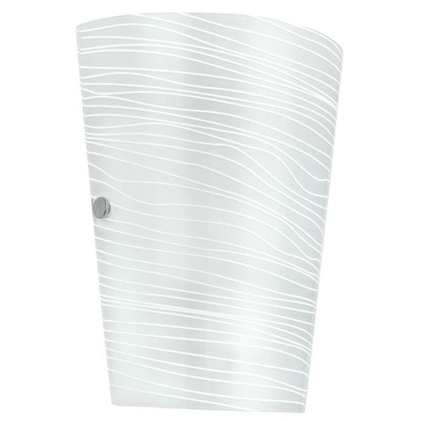 Caprice Indoor Wall Light 1Lt in Chrome Depth: 185mm, Height: 230mm, Overhang: 15mm, Weight: 0.864kg. Socket: E27, Max Wattage: 1x60W, Suitable for: A++ - E. Enclosure Material: steel, Enclosure Colour: chrome, Glass/Shade Material: satinated glass, Glass/Shade Colour: white with decor. Protection Rating: IP20, Protection Class: 1, Line Voltage: 220-240V,50/60Hz, Operation Voltage: 220-240V,50/60Hz. Brand: Eglo Lighting, Product Type: Indoor Wall Light, Colour: Chrome, Bulb Required: 1, Bulb Included: No, Bulb Type: E27, Wattage (max): 60w, Voltage: 220-240v, IP Rating: IP20.