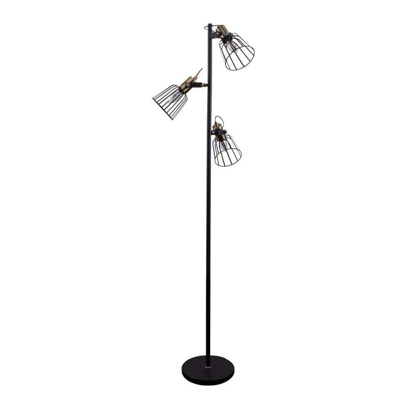 DOMUS Ashley-3Fl 3 Light Cage Floor Lamp features a wire guard shade with a slim and linear appearance. The antique brass details complement the black metal shade on the light fixtures of this lamp.