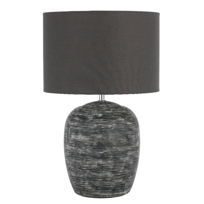 The Dusty table lamp is a rustic and earthy addition to any room. The ceramic base is shaped like an urn and is decorated with a weathered brushed texture, giving it a natural and outdoor feel. The grey taupe color adds a touch of sophistication to the lamp. The fabric drum shade is of matching color, adding a cohesive look to the lamp. The shade diffuses the light to create a warm and inviting atmosphere. This lamp is perfect for illuminating a living space and is a unique addition to any home.