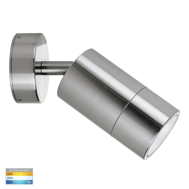 Maxi Tivah 316 Stainless Steel TRI Colour Single Adjustable Wall Pillar Light. Matching backing plate. Swivels 90° & 270°. High output reflector maximizes light. TRI Colour 3000k, 4000k + 5500k. IP65. 60° beam angle. 240v AC. 3 years warranty. 218mm length, ø75mm & ø85mm diameters.