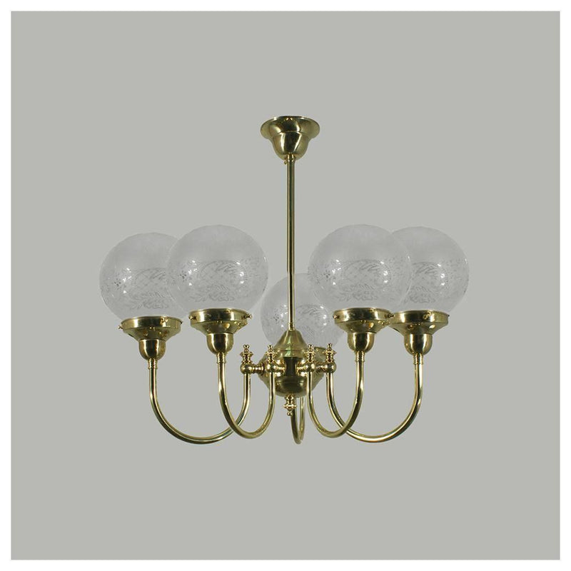 Traditional solid brass pendant light with upward facing arms with etched glasses.