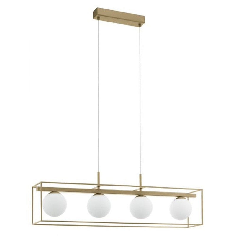 Vallaspra Pendant Light 4Lt in Champagne will add a touch of class over your kitchen island bench or dining table. Specifications: Material: Steel Colour: Champagne Glass/Shade Material: Glass Opal-Matt Globe Base: E14 Wattage: 4x 40w Globe: Excluded Voltage: 220-240v,50/60Hz IP Rating: IP20 Dimension: Height: 1100mm Width: 165mm Length: 910mm Weight: 3.76kg Product Specifications Brand Eglo Lighting Sku(s) 97793.