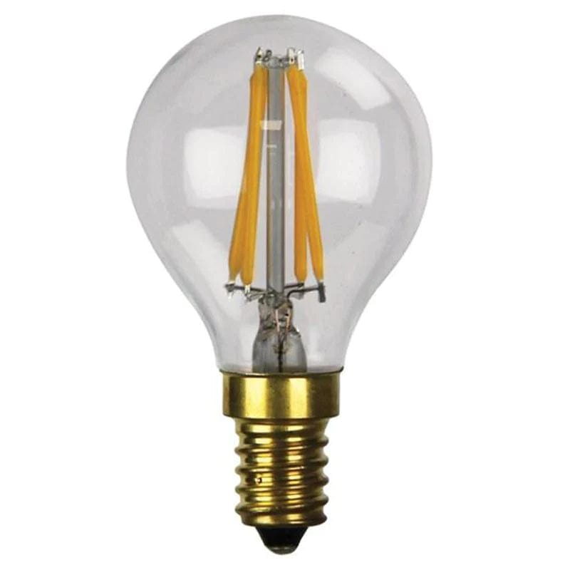 2w, 4w LED E14 Fancy Round Globe Warm White retrofit globe, looks great in retro style, industrial and even contemporary style light fittings. The LED “filament” resembles a traditional halogen filament, giving a warm glow, greater light output and longer life, and is energy saving with lower energy consumption. This lamp is dimmable with most LED friendly dimmers. With its traditional filament-style and energy-saving design, this fancy round LED retrofit globe produces a warm glow with higher light output for a longer life - all while reducing energy consumption. Plus, take your lighting to the next level with easy dimming capabilities.