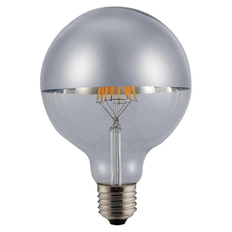 6w LED E27 G95 Globe Warm White 2700k LED decorative globe. Spherical is ideal for use in open pendants or table lamps. The crown is designed to reflect the light back towards the light fixture itself. (warm tones). This classic, retro-inspired design features warm tones, perfect for casting a cozy atmosphere in any room. The crown silver of the LED globe ensures optimal light reflection for a fixture that adds more than just illumination. Its distinctive retro style and crown-silver finish provide a unique aesthetic that is certain to draw attention, while its warm tones create a cozy atmosphere that will make any room feel more inviting.