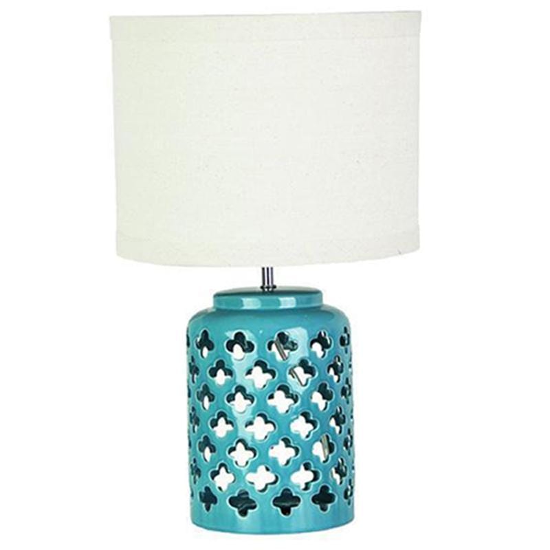 Our Casbah Ceramic Table Lamp is available in Teal or Antique White, supplied with its own beige flax hardback shade. Moorish symbols are cut from the base of the lamp to give a stylish and trendy feel to any room. An ideal bedside lamp. Switch is conveniently located on the cord.