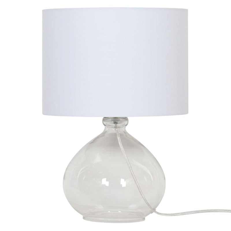 The lightweight and transparent glass base and white cotton shade provide a timeless look, while the cord switch allows for effortless control. Upgrade any space with this stylish piece. The Table Lamp is ideal for any home or office decor. Crafted from lightweight and transparent glass and finished with a white cotton shade, this lamp offers a sophisticated touch with modern convenience.