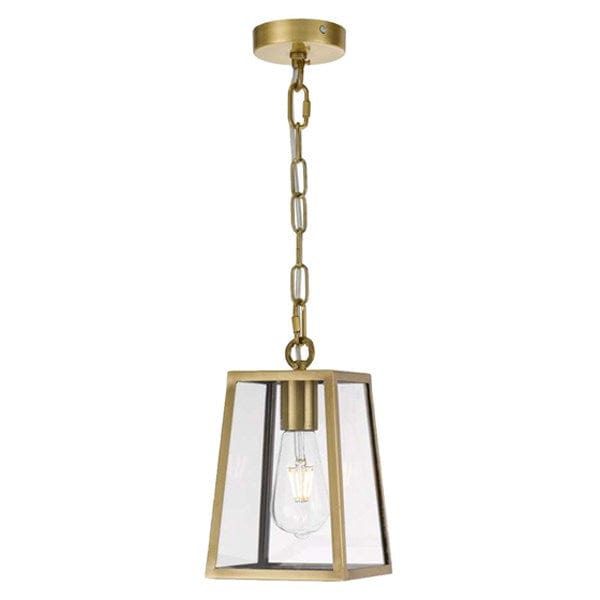 Cantena 15 Industrial Pendant Light Small 1Lt is a bold yet simple vintage outdoor pendant lamp. The tapered frame holds trapezoid clear glass and is suspended by a short rod with chain. The Cantena family is crafted in solid brass and finished in polished brass or brass painted in black.