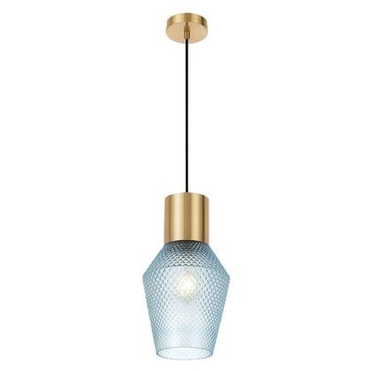 Available as a single pendant or table lamp. Glassware is presented in clear, blue smoke, gray smoke, or opal matt together with a contrast antique gold metalware.
