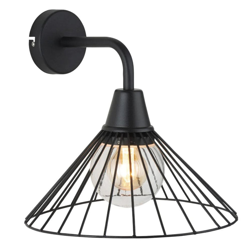 Eva Outdoor wall Light in Black An elegant glass shade wall light with steel cage for a vintage appearance Features: E27 max 40W Clear glass shade Powder coated iron body IP44 rated weather resistant Specifications: Materials: Steel Colour: Black Globe: E27 Product Type: Wall Light IP Rating: IP44.