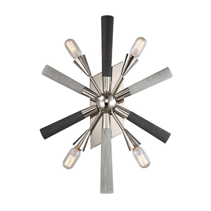 Modern Wall Light Polished Nickel with dark & light grey washed wood. This classic fixture features a unique two-tone design that's perfect for a modern decor. Its polished nickel finish and combination of dark and light grey washed wood offer timeless style and an effortlessly chic look.