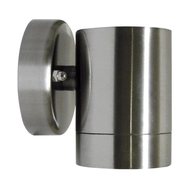 Riva Exterior Wall Light Down 1Lt in Stainless Steel Specifications: Product Name: Riva Category: Exterior, Wall Light Use: Outdoor Style: Modern Type: Down Colour: Stainless Steel Lamp Base: GU10 Lamp: Halogen Globe Included: Yes IP Rating: IP44 Wattage: 35w Light: 1 Warranty: 2 Year Dimension: Width/Diameter: 90mm Height: 100mm.