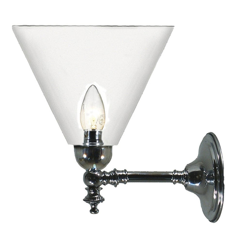 Waubra Indoor Wall Light Brass or Chrome in Cono Clear/Opal Glass The modern design coupled with the antique feel of the brass or chrome finish creates an eye-catching look. With extra-durable glass, you can enjoy this wall light in any room of your home. This wall light is perfect for tradition-inspired yet modern spaces.