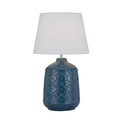 Baci Table Lamp A pleasingly crafted from ceramic with a raised antique motif texture, the Baci glazed table lamp is finished in either a blue, butterscotch or grey glaze. This elegant lamp comes with a fabric shade, designed to complement any look. Adding an elegant touch to any room, the Baci Table Lamp's sleek design and antique motif texture bring a feeling of timeless sophistication to the classic look. With a choice of a blue, butterscotch, or grey glaze and a complementary fabric shade, this table lamp is the perfect addition to your home.